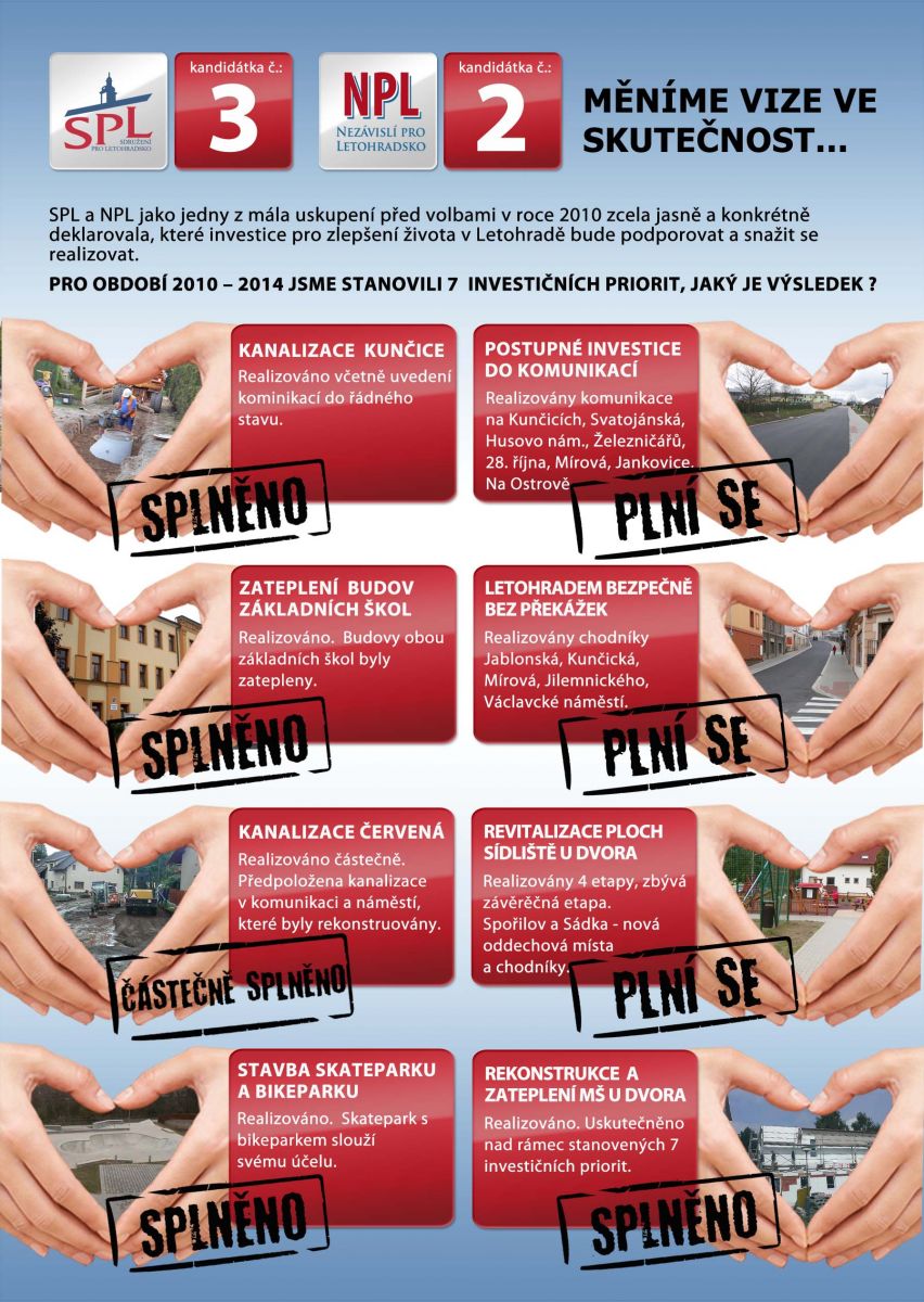 Je potěšitelné, že zásadní z deklarovaného v našem volebním programu v roce 2010 nebylo pouhými sliby, ale věcmi, které se realizovaly. Mohlo se to podařit díky dobré spolupráci se všemi radními a zastupiteli. To nakonec můžete sami bez ovlivňování kýmkoli posoudit.Ze zásadních záležitostí to jsou zejména zateplení obou velkých komplexů základních škol a nová kanalizace na Kunčicích. Pozadu nezůstaly ani místní komunikace, rekonstruované a nové chodníky, několik realizovaných etap rekonstrukce ploch největšího sídliště U Dvora s novým dětským hřištěm.