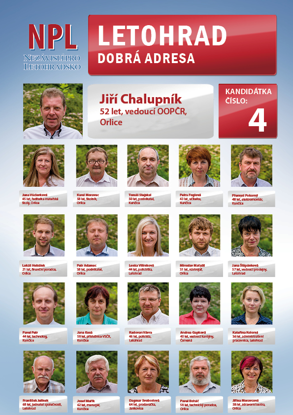 Čtyřleté volební období se pomalu chýlí ke konci a v pátek 5. a v sobotu 6. října nás opět čekají volby do městského zastupitelstva. Naše volební uskupení Nezávislí pro Letohradsko se rozhodlo, že bude znovu usilovat o Vaši přízeň, o Vaše voličské hlasy. Pracovat pro veřejné blaho je práce zajímavá a bohulibá, někdy však také dosti náročná, neboť, jak sami jistě víte, nikdy se nedokážete zavděčit všem lidem, co člověk, to jiný názor. Přesto však chceme pokračovat v započaté práci a společně se Sdružením pro Letohradsko usilovat o to, aby se naše město i nadále zdárně rozvíjelo. Přestože jsme pro letošní volby maličko obměnili naši kandidátní listinu, stavíme znovu na ochotných a spolehlivých lidech, kteří jsou připraveni pracovat pro Vás všechny.