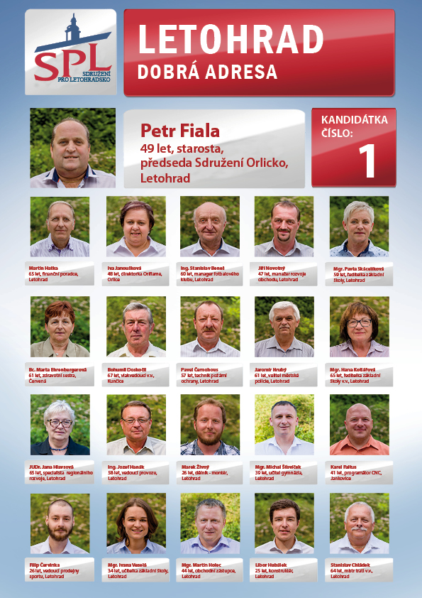Jedničku nám vylosovali, nemyslíme si, že jsme jedničky či máme patent na rozum, ale co děláme, děláme s rozvahou a plným nasazením! Dáváte-li přednost výběru kandidátů a chcete nás podpořit, k dispozici máte i naše kolegy z koaliční kandidátky NPL (č.4). Přeji Vám dobrou volbu, prosím, najděte čas a přijďte k volbám. Ať již volby dopadnou jakkoli, mějme místo, kde žijeme, rádi. LETOHRAD, to je opravdu DOBRÁ ADRESA!