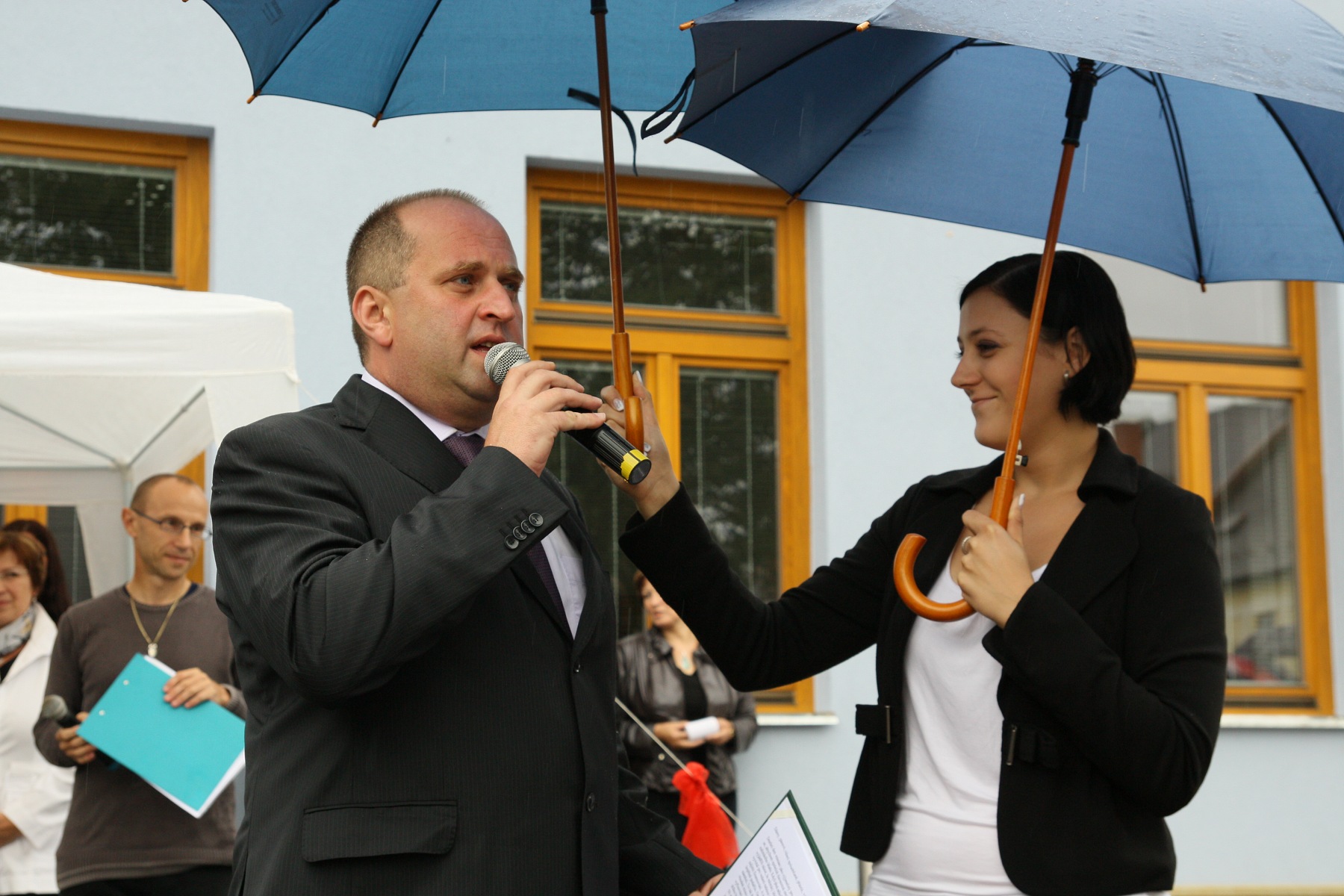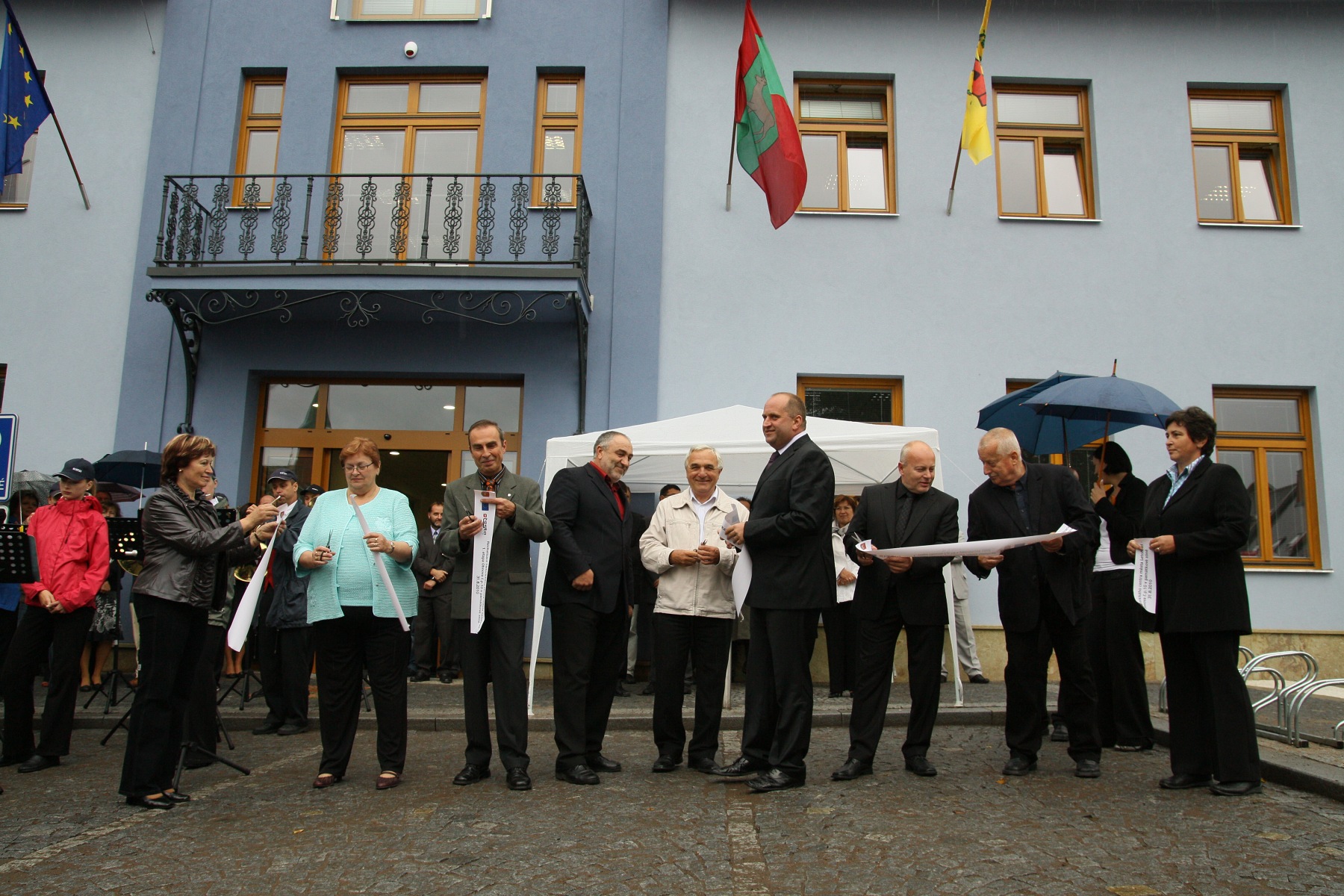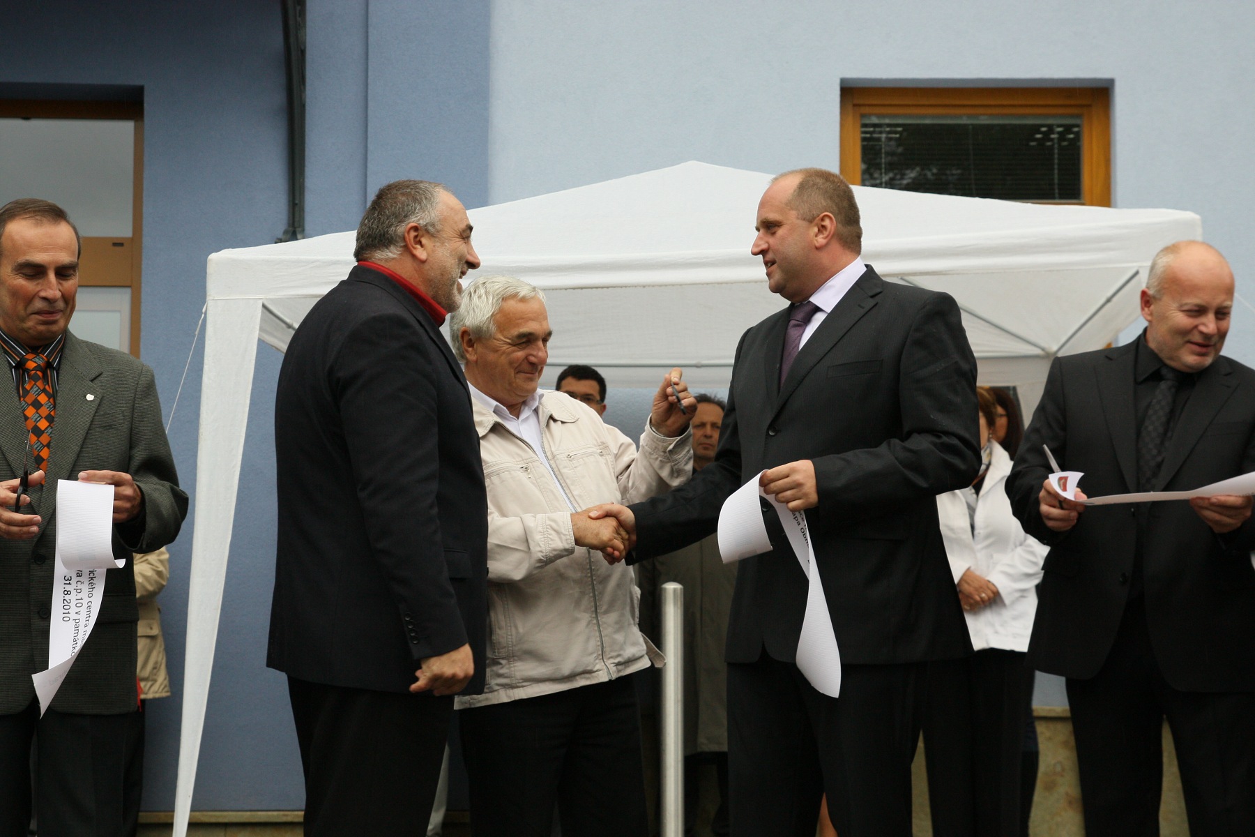 Pásku slavnostně přestřihli (zleva): Judr. Jana Hlavsová (tajemnice MěÚ), Pharm.Dr.Jiří Skalický (poslanec, rodák z Letohradu), Petr Fiala (starosta města, který k přestřižení pásky společnou rukou pozval své dva porevoluční předchůdce ve funkci starosty Ing. Petra Šilara a Vladimíra Tomka), Miloš Pospíšil (ředitel zhotovitele stavby Testa, s.r.o.) a Ing. Arch. Zdeněk Auer (městský architekt).